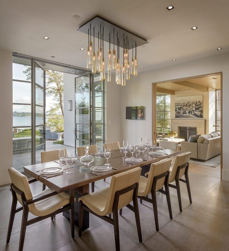 - Thiết kế bàn ăn đơn giản tông màu nâu kết hợp ghế màu be và lót đệm êm ái. Gia đình có thể lựa chọn không gian ăn uống tại đảo bếp hoặc tại bàn ăn rộng rãi này. Không gian ăn uống được trang trí thêm đèn chiếu sáng nhiều bóng tỏa xuống, tạo hiệu ứng ánh sáng vàng ấm cúng cho căn phòng ăn.