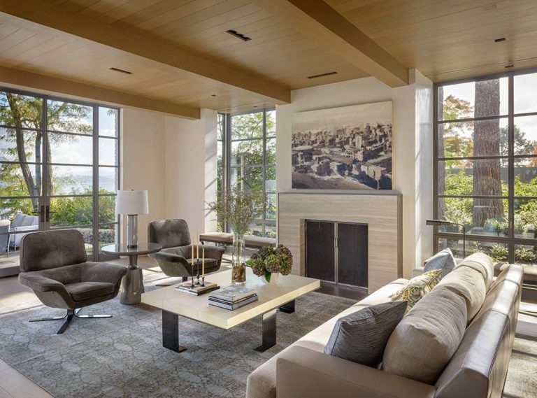 Đặc biệt căn phòng khách được thiết kế lò sưởi sát tường, kết hợp tranh trắng đen tô điểm cho không gian thêm phần nổi bật. Xung quanh sử dụng cửa kính thay vì những bức tường thô sơ, vì vậy căn phòng khách luôn tràn ngập ánh sáng tự nhiên.