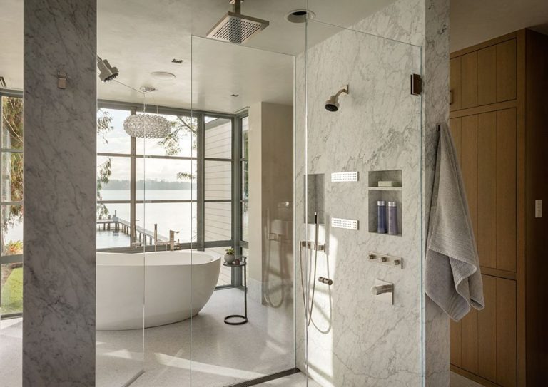 - Phòng tắm kết hợp nhà vệ sinh được thiết kế đơn giản, ốp đá tạo không gian sáng và sang trọng. Thiết kế bồn tắm đơn giản ngăn cách với không gian bên ngoài bằng cửa kính chống và đập.