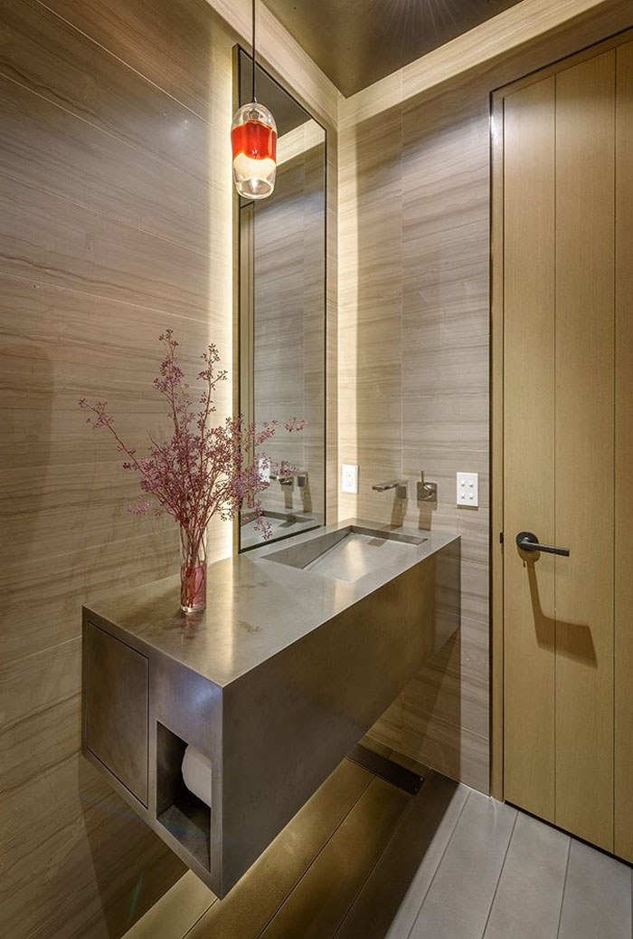 Một cách trang trí phòng tắm khác trong phối cảnh thiết kế nội thất biệt thự này. Vẫn là sự đơn giản kết hợp ánh sáng và lọ hoa, mang đến không gian ấn tượng và ấm cúng.