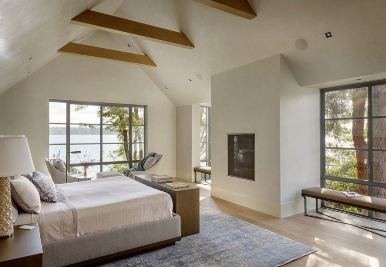 Căn phòng ngủ với thiết kế cửa kính rộng, thoáng đón ánh sáng tự nhiên. Đây là một trong những nguyên tắc trong thiết kế nội thất cao cấp thường áp dụng. Ánh sáng tự nhiên mang đến không gian tràn đầy năng lượng, thu hút năng lượng tốt và lưu thông khí thuận cho căn biệt thự.