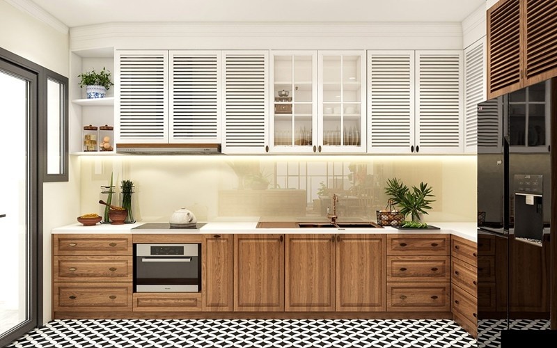 Kệ lưu trữ đồ bếp sơn màu trắng tạo sự đối lập tinh tế với nền sàn nhà láy gạch đen.