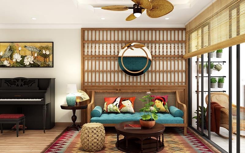 Phòng khách của ngôi nhà hiện đại ấm áp, gần gũi với những hình ảnh quen thuộc xưa như mành tre, gối in họa tiết tranh đông hồ...