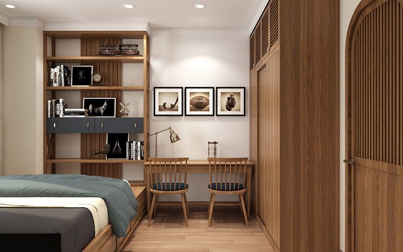 Phòng ngủ cho con được thiết kế hiện đại nhưng vẫn giữ nội thất gỗ chủ đạo.