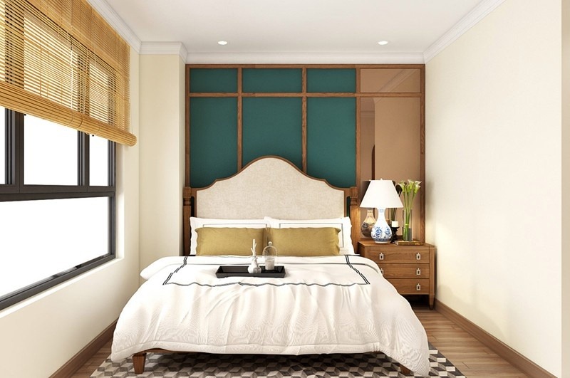 Phòng ngủ cũng có nhiều nét hoài cổ như rèm tre nơi cửa sổ, đèn ngủ đầu giường...