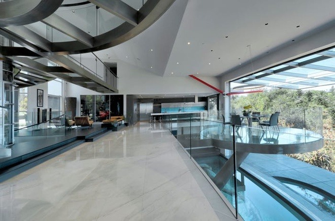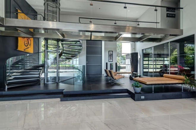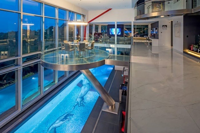 Tại phòng khách, cầu thang máy trong suốt giống máy dịch chuyển tức thời trong phim "Star Trek". Tầng dưới phòng khách là bể bơi xanh mát.