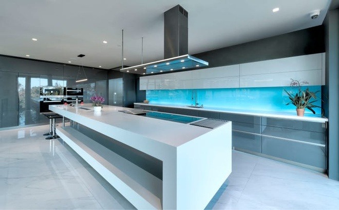 Phòng bếp màu trắng, bạc chủ đạo được thiết kế tựa như phòng điều khiển tàu không gian. Nơi đây tích hợp thêm kho lưu trữ thức ăn.