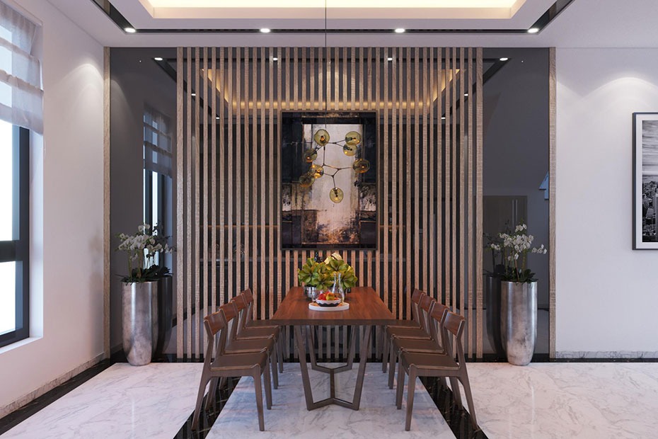 Phong cách hiện đại đơn giản còn được thể hiện rõ từ phòng bếp cho đến phòng ăn. Không phải là những bộ bàn ghế cầu kì tiểu tiết, chỉ đơn giản là bộ bàn ghế bằng gỗ với màu sắc hết sức hài hòa, nhã nhặn cũng đủ mang lại cho gia chủ một phong cách sống chuẩn hiện đại.