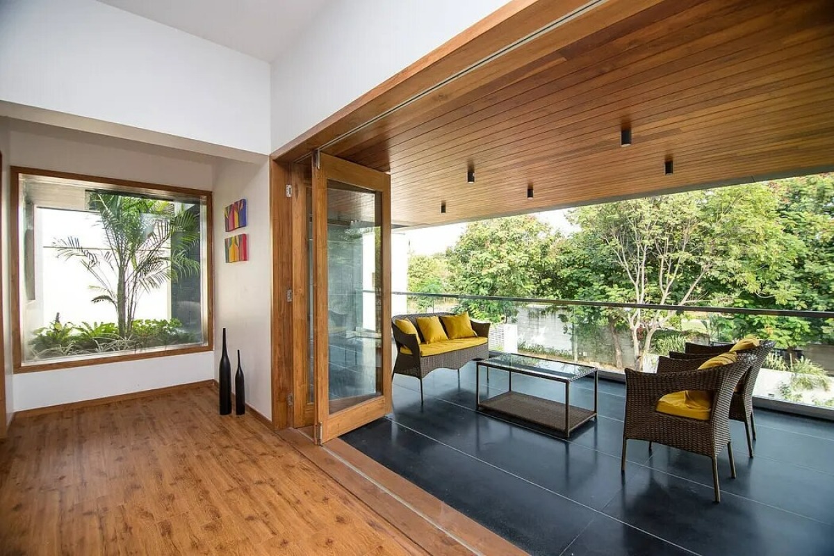 Lan can bằng kính càng khiến ngôi nhà toát lên vẻ hiện đại, gọn ghẽ. Những bức ảnh của các thành viên treo dọc hành lang tăng thêm sự gần gũi, ấm cúng, tạo sợi dây gắn kết giữa các thành viên trong nhà. Một bộ bàn ghế đặt tại ban công, nơi các thành viên có thể vui vẻ uống trà, đọc sách hay tán gẫu.