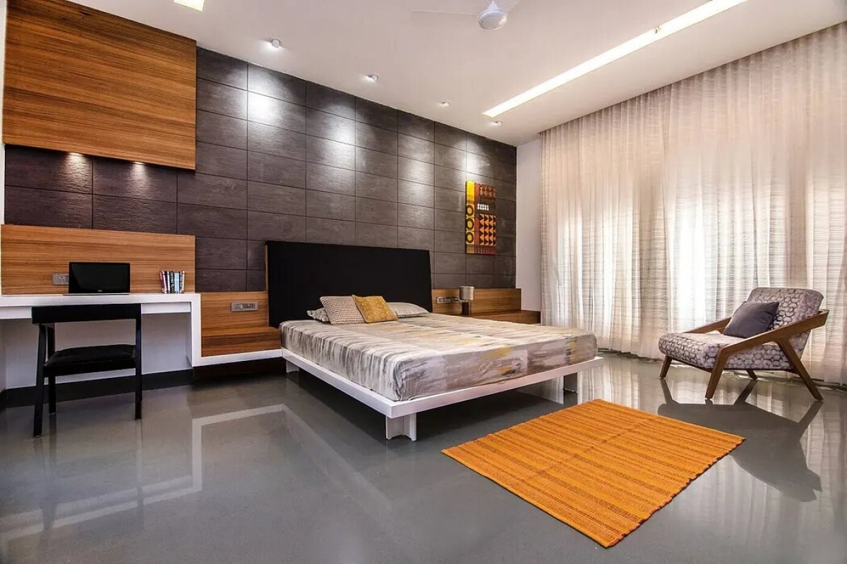 Phòng ngủ bố trí bàn làm việc, ghế thư giãn cùng ban công rộng.