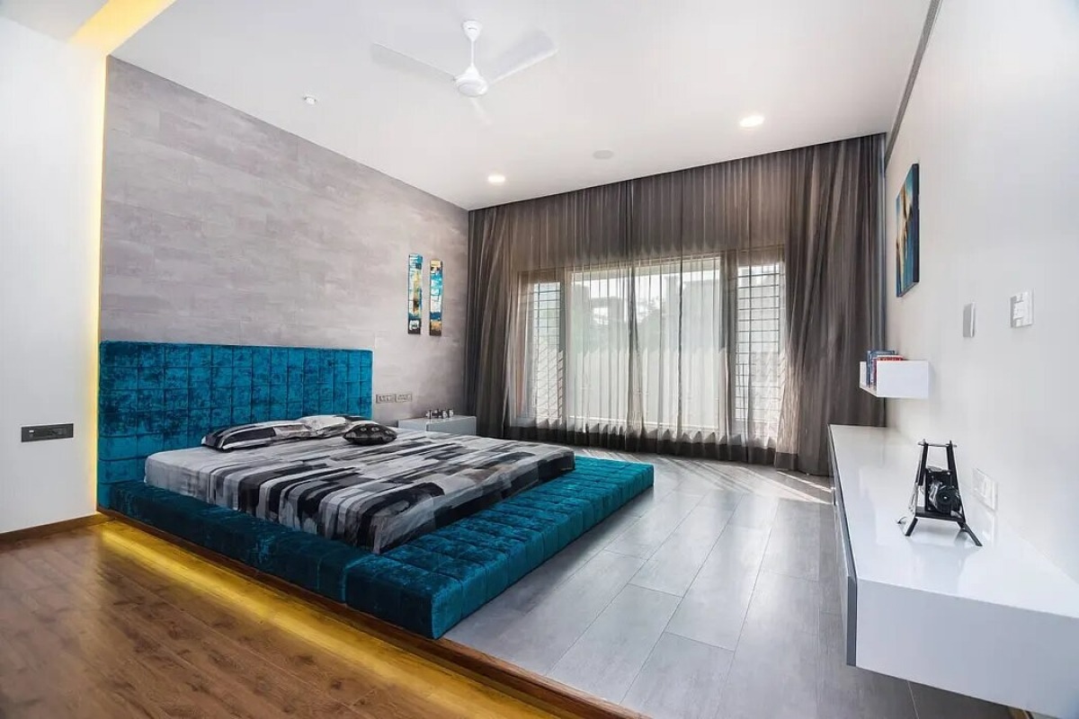 Chiếc giường ngủ thấp, có màu xanh cổ vịt nổi bật trong phòng ngủ của cậu con trai chủ nhà.