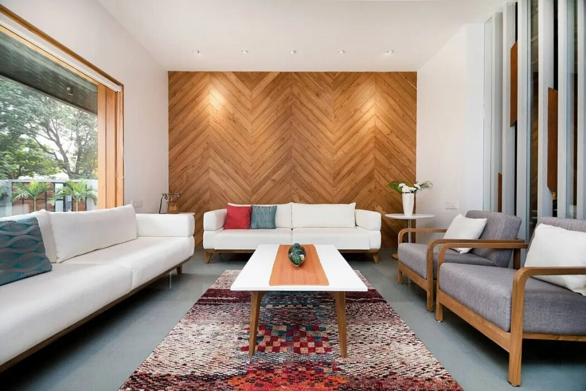 Thảm trải sàn dệt bằng thổ cẩm, xua tan sự nhàm chán cho khoảng nền bê tông bên dưới. Nhờ có diện tích rộng rãi, phía trước nhà gia chủ sắp xếp một khoảng sân trước, mà từ phòng khách hay bất kỳ phòng nào khác đều có thể nhìn thấy. Những chậu cây xinh xắn đặt dưới cầu thang, tạo nên sự thú vị cho từng góc nhỏ trong nhà.