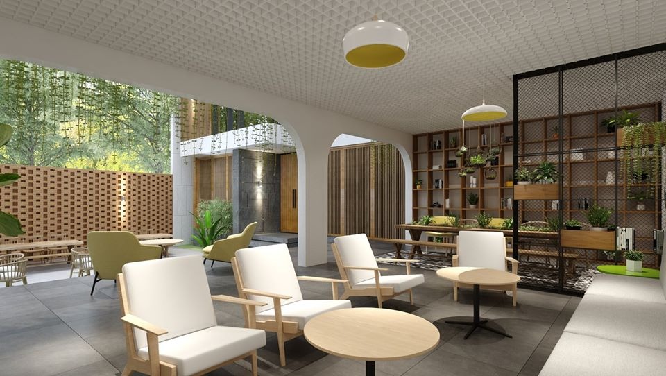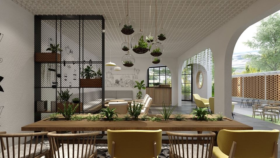 Không gian bên trong của quán có sự kết hợp hài hòa giữa sàn gạch tông màu xi măng với ghế sofa đơn bọc nệm màu be và bàn tròn mặt gỗ. Trần được xử lý khéo léo với mảng thạch cao đầy tính nghệ thuật. hệ thống đèn thả kiểu dáng úp và tủ gỗ trưng bày tiểu cảnh xanh mang lại một sự phối hợp tràn ngập sức sống đầy mới mẻ chung cho góc nhỏ phía dưới của quán.