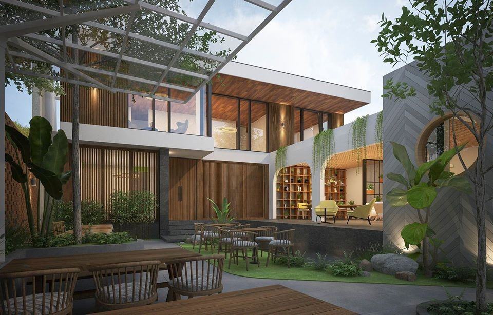 Những mảng tường được trang trí thành bức tranh nghệ thuật, sự phức hợp của tường gạch mộc, kết hợp với mảng tường ốp gỗ, và sự tinh tế trong việc bài trí tiểu cảnh sân vườn, kiến trúc sư đã mang đến một tác phẩm nghệ thuật hoàn hảo trong phương án mẫu thiết kế quán cafe kết hợp nhà ở cho chủ đầu tư.
